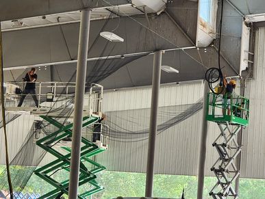 This structure was almost 50,000 square feet of space and we ended up installing smaller nets per each bay and then bigger nets across the middle and zippers installed where needed for access behind the nets