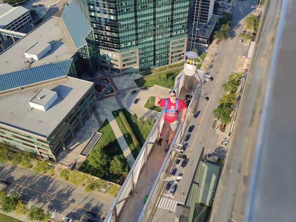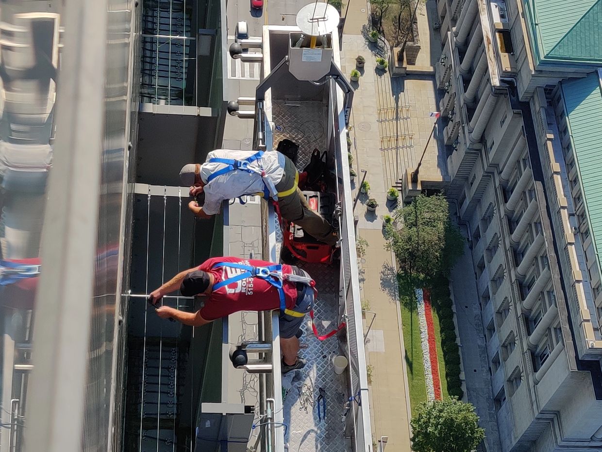Jobs like these don't come along as much and here our team was learning how to maneuver the window washing platform. This picture, they are just over the top parapet of the building about to descend.