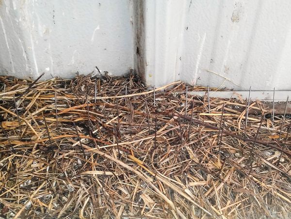 As you can see here, the bird spikes used were not successful. Birds like sparrows and starlings can use the spikes as nest holding material and they covered these spikes. Midwest Bird Control was called in for the resolution.