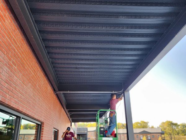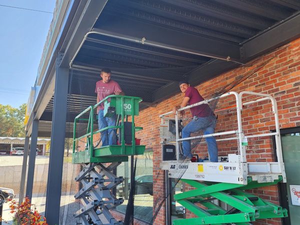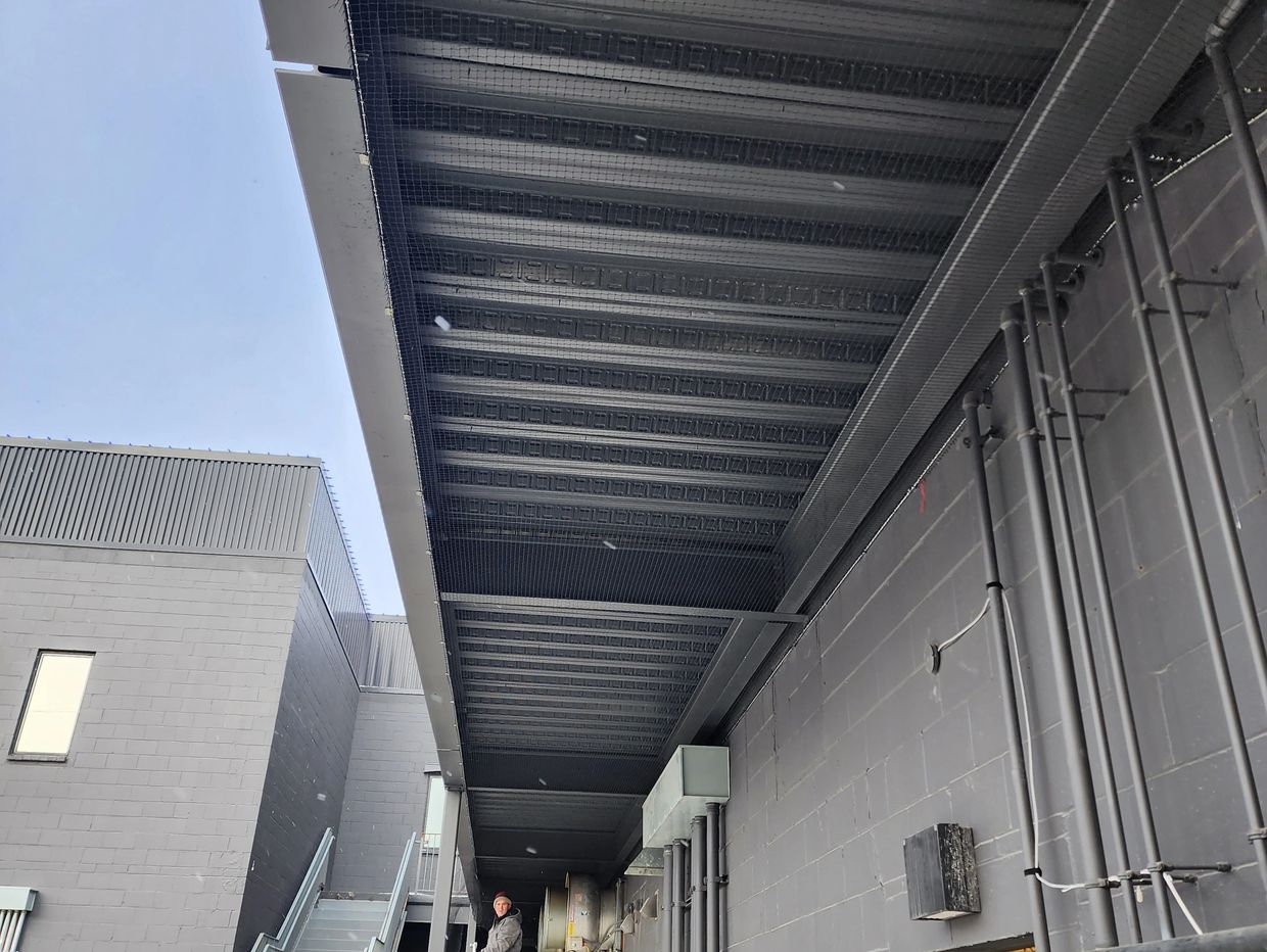 Midwest Bird Control was called in to install the bird netting on 5 strip mall canopies in central Omaha. Birds were nesting above heaters, lights, the gap between the brick and canopy as well up in the gaps above the beams